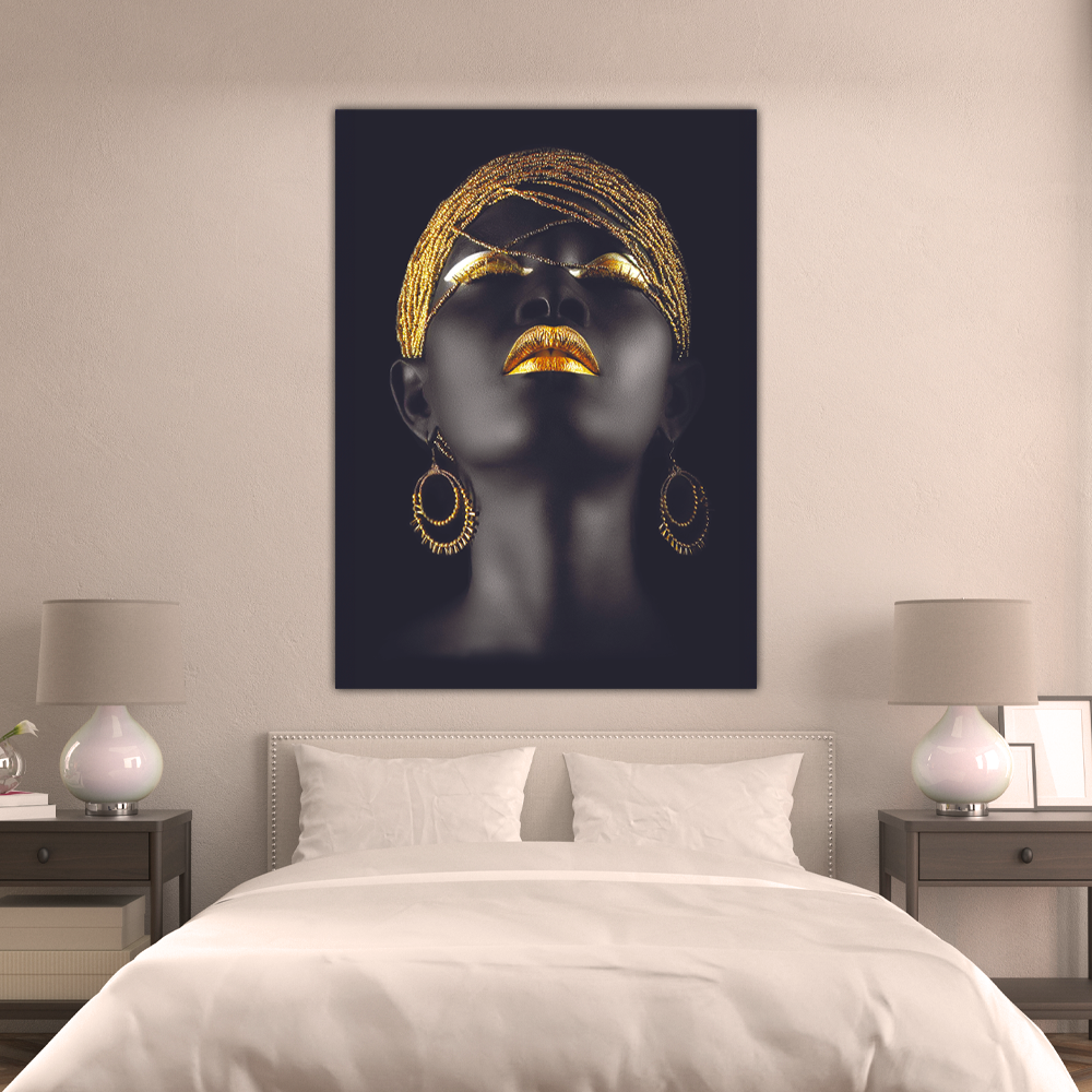 Il quadro su tela “African Black & Gold” è una celebrazione della bellezza e della maestosità delle donne africane, incarnate in un’opera d’arte che fonde l’eleganza classica con dettagli lussuosi. Al centro dell’opera, emerge la figura di una donna africana, dipinta con intensità di tonalità nere e avvolta in una sinfonia di dettagli in oro.