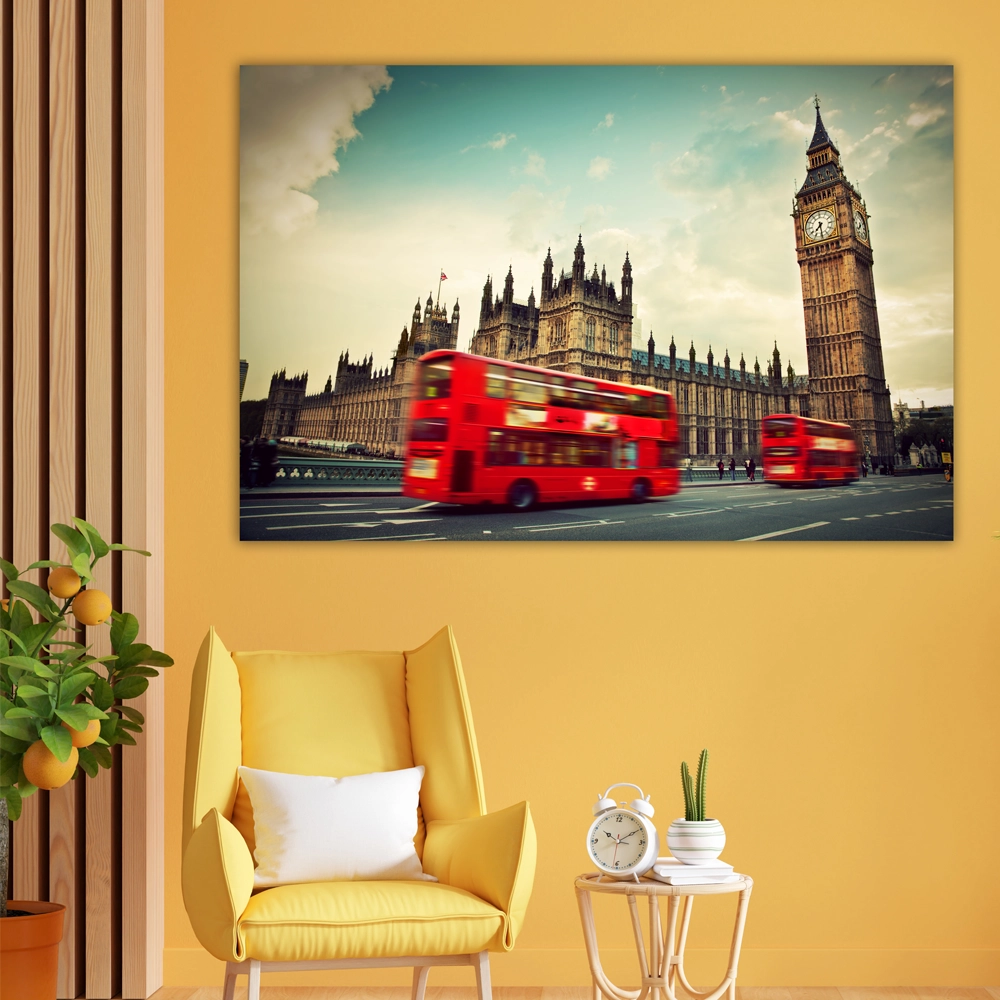 Questo quadro mostra una foto iconica che cattura un’iconica scena urbana di Londra del famoso Big Ben, dove elementi architettonici famosi si fondono con aspetti caratteristici del trasporto cittadino, rappresentando così un momento dinamico e colorato della vita quotidiana in una nota metropoli come Londra.
