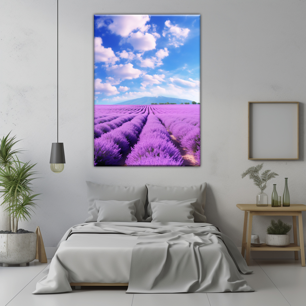 Un Cielo Incantevole: Il cielo azzurro è il perfetto contrasto per i campi viola di lavanda. Le nuvole bianche che si librano nel cielo aggiungono un tocco di leggerezza e di bellezza all’orizzonte.