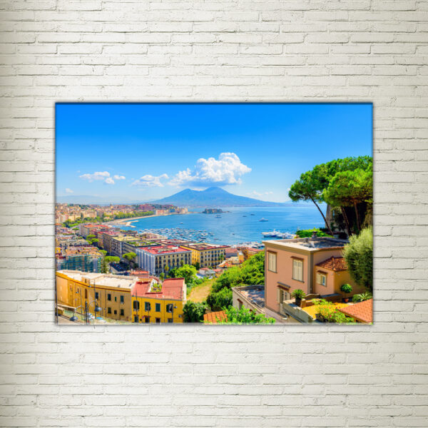La dettagliata resa artistica mette in risalto la struttura del castello, con le sue mura antiche e le torri imponenti che si riflettono sull’acqua del golfo. Il Castel dell’Ovo assume una luce dorata, accarezzato dal sole del tramonto o dalla luce mattutina, creando una scenografia magica e suggestiva.