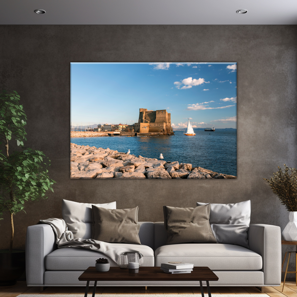 Il quadro su tela che raffigura l’iconica foto del Castel dell’Ovo dal Lungomare Caracciolo offre uno sguardo mozzafiato sulla bellezza suggestiva di Napoli. La scena cattura la maestositร del Castel dell’Ovo, situato su una piccola isola nel Golfo di Napoli, con il celebre Lungomare Caracciolo che si estende lungo la costa.