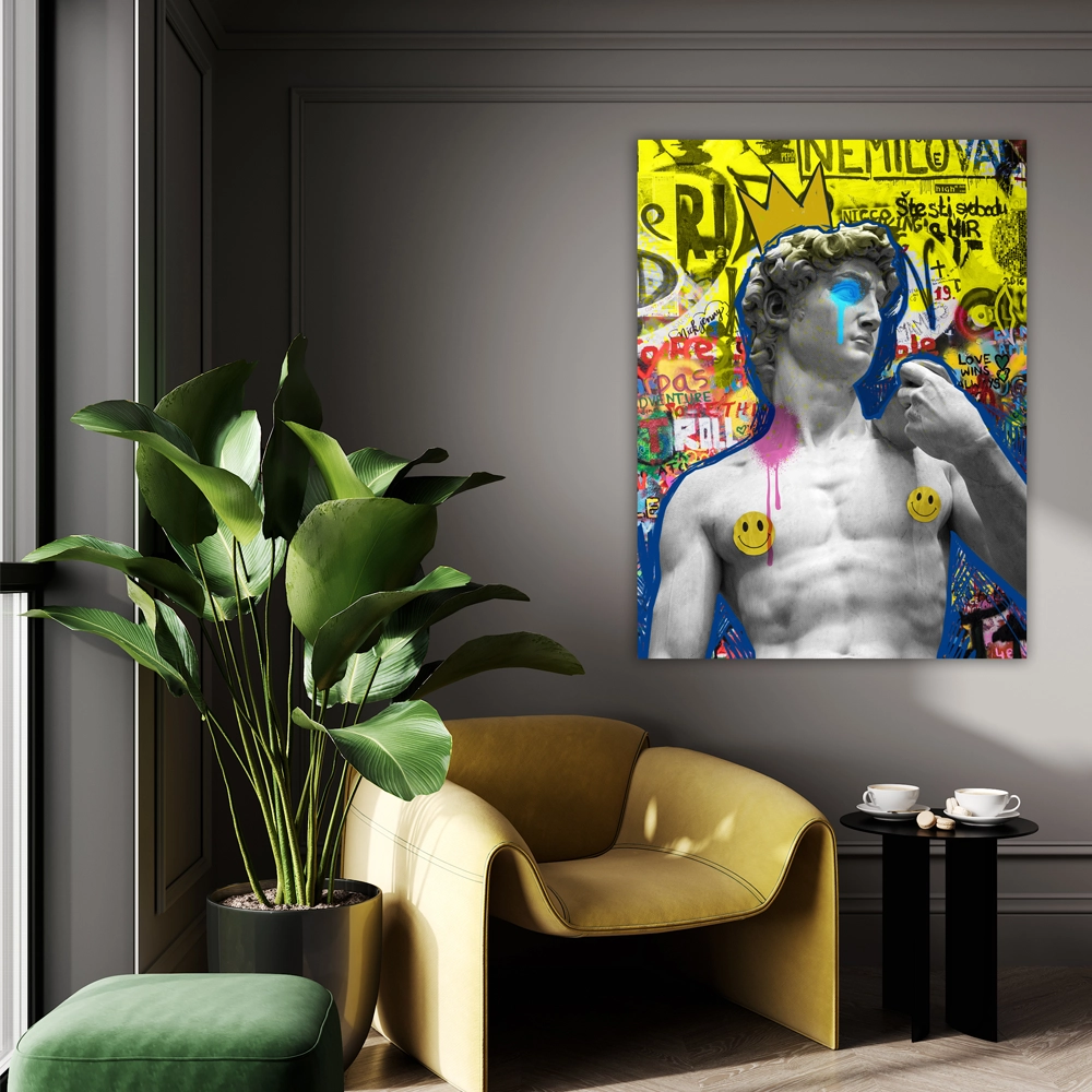 Questo quadro presenta una statua classicamente modellata con aspetti pop-art moderni. Colori vivaci, graffiti e simboli contemporanei come emoji adornano lo sfondo e la figura centrale.