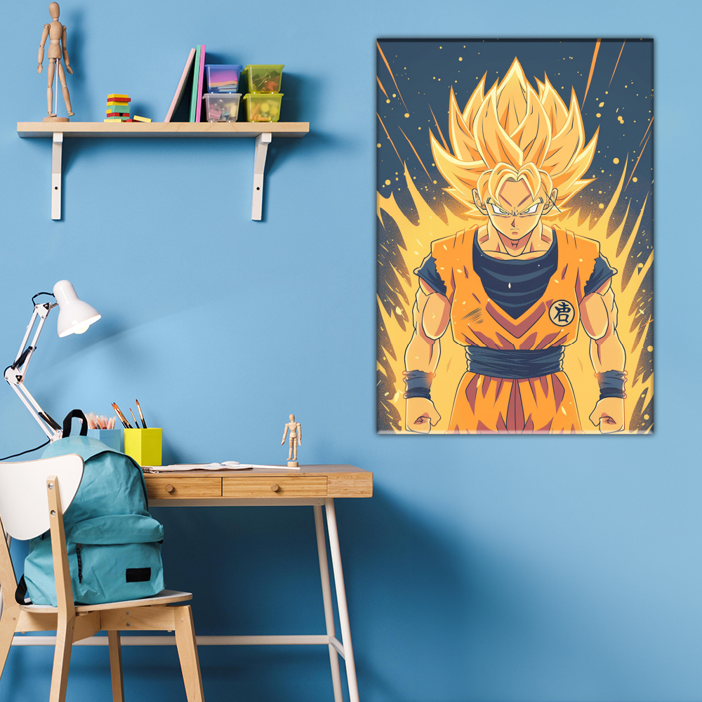 La tela mostra Goku nella sua forma Super Saiyan, con capelli dorati e alzati in punta, emblema della sua trasformazione. Circondato da un’aura di energia esplosiva che riflette la sua potenza, la figura dominante di Goku รจ piena di determinazione e forza, pronta a sfidare qualsiasi avversario.
