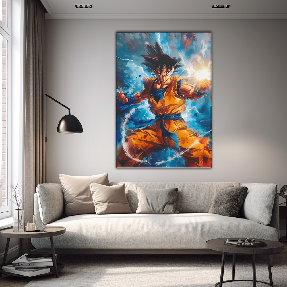 Il quadro su tela presenta Goku, il protagonista di “Dragon Ball”, in una posa di combattimento energica con un pugno diretto verso lo spettatore. Egli รจ circondato da un’aura elettrica che evidenzia la potenza e l’intensitร del momento.