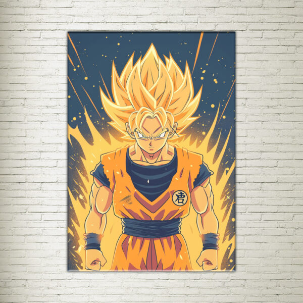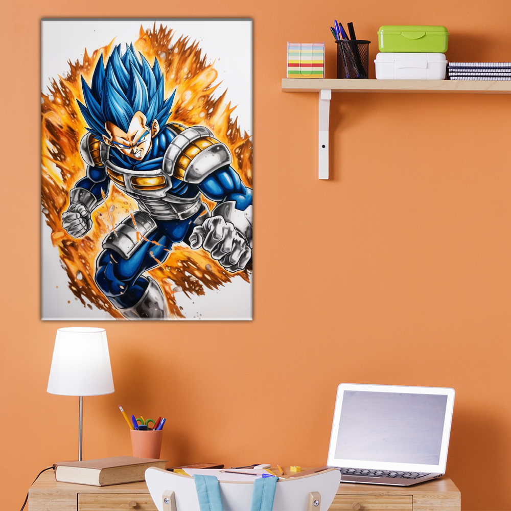 Il quadro su tela raffigura Vegeta, uno dei personaggi principali dell’universo di “Dragon Ball”. Vegeta è mostrato in una posa dinamica con i capelli blu, distintivi del suo potere Super Saiyan Blue, sfondando con energia e determinazione.