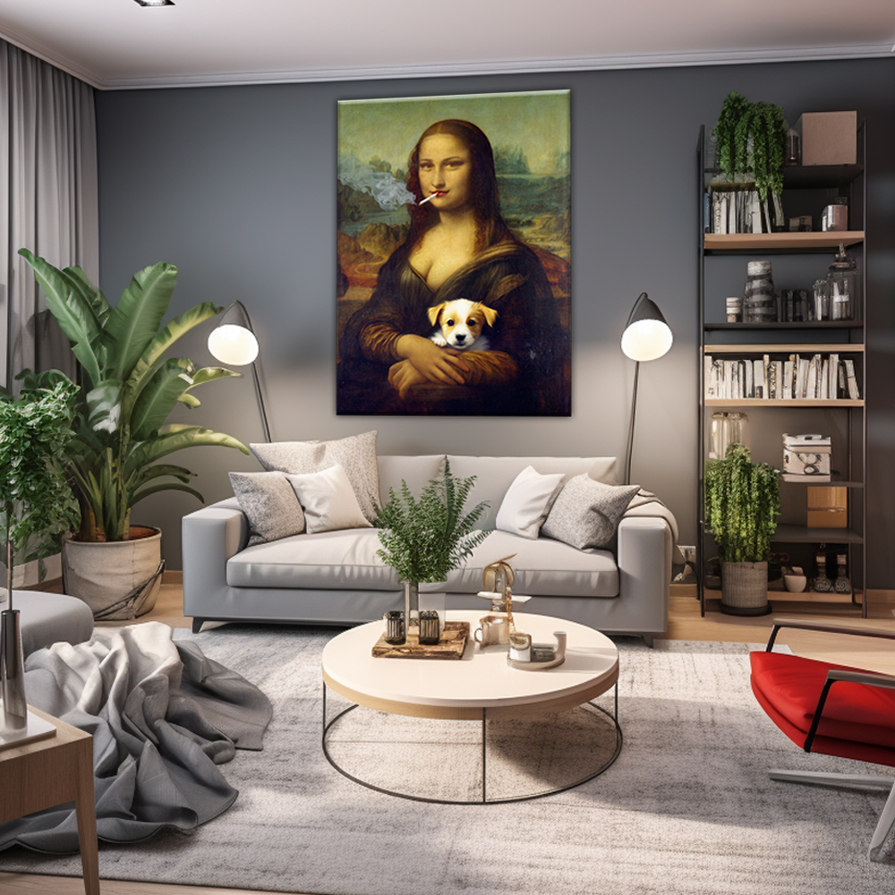 Gioconda 2.0: Ciò che rende questa opera d’arte unica sono i dettagli inaspettati. Mona Lisa sfoggia un rossetto audace, un cane amorevole, e tra le sue labbra tiene una sigaretta accesa. Questi elementi aggiungono profondità e mistero al ritratto iconico.