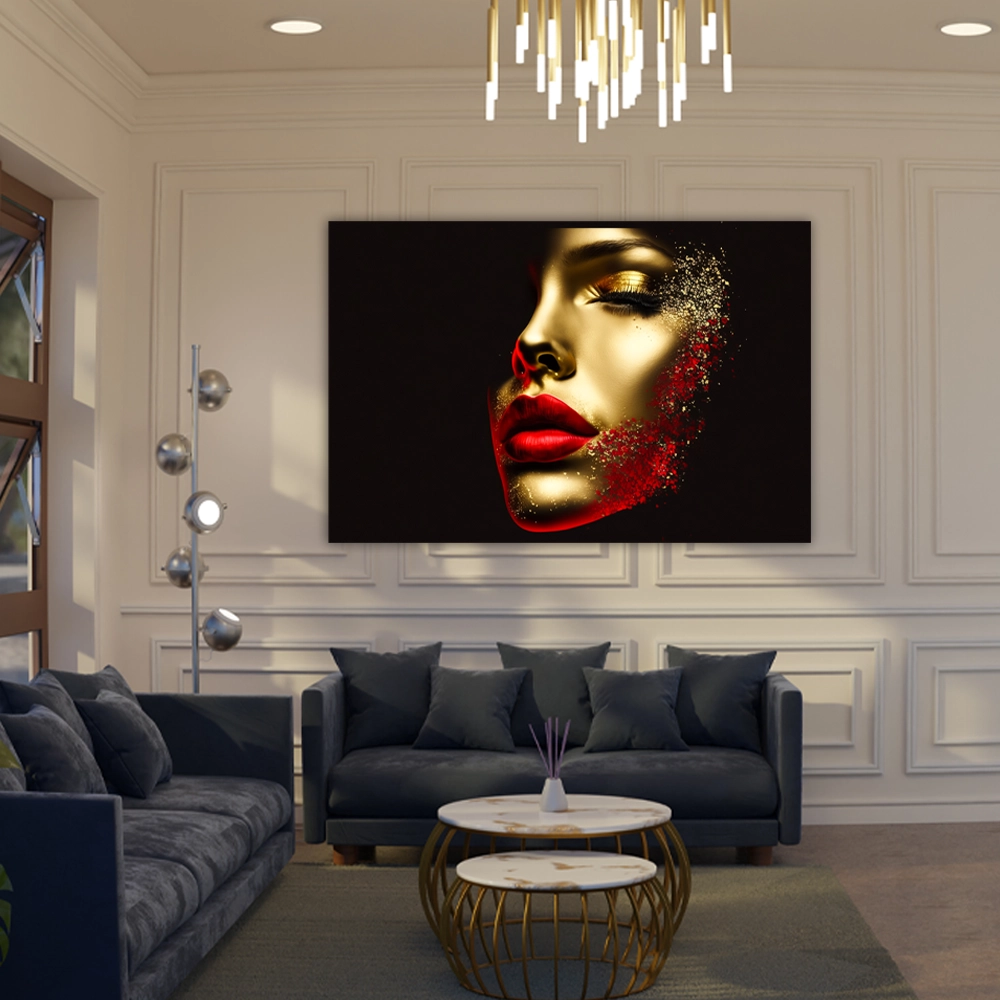 Questo quadro mostra un’immagine di una donna di colore oro con rossetto rosso, il viso è ricoperto di un rosso intenso e glitter. Un quadro adatto per tutti i tipi di arredamenti, dal classico al contemporaneo.