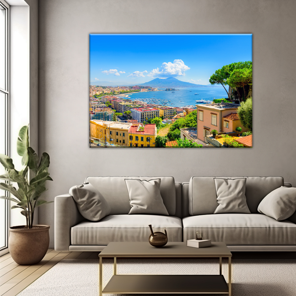 Il quadro su tela raffigurante l’iconica foto del Golfo di Napoli è un omaggio visivo alla bellezza mozzafiato di questo luogo emblematico. La scena cattura la vista panoramica del golfo, con il Vesuvio che fa da maestoso sfondo, mentre il mare si estende in una tavolozza di tonalità azzurre e verdi.