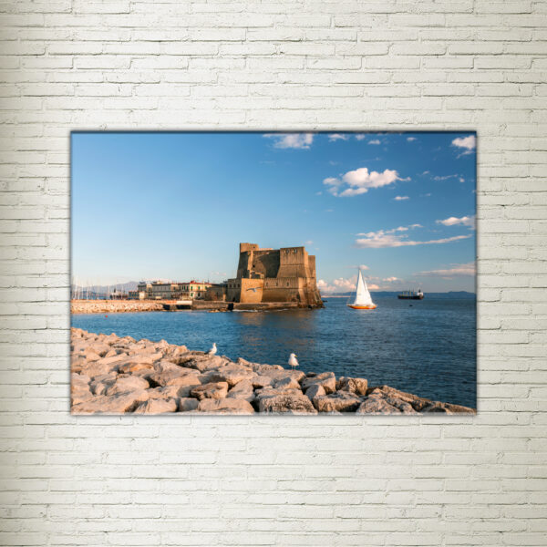 La dettagliata resa artistica trasmette la serenità dell’acqua del golfo, con le sue sfumature che riflettono il cielo e la luce solare. La città di Napoli si staglia pittorescamente lungo la costa, con la sua architettura distintiva e i colori vivaci delle case.
