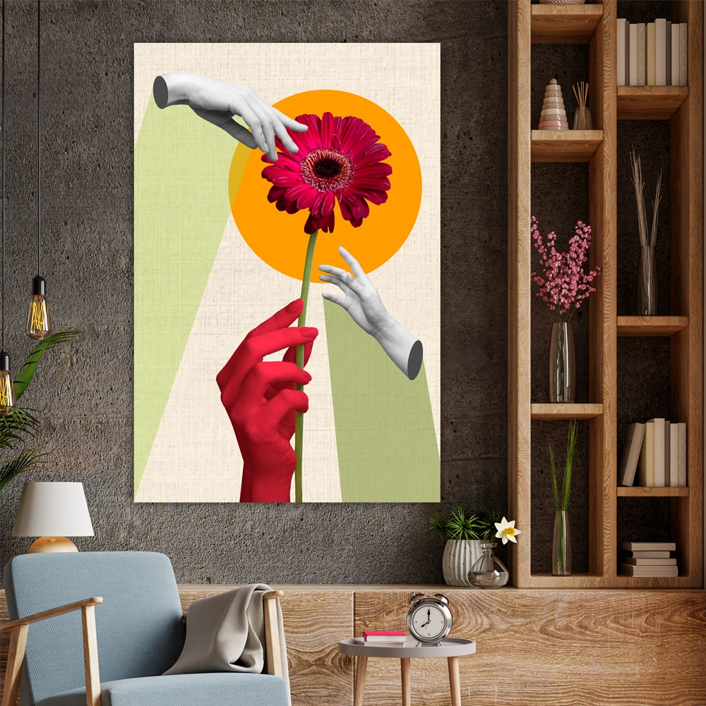 Questo quadro mostra un’immagine contemporanea, delle mani con un fiore di colore rosso al centro del quadro stesso. Una mano di colore rosso รจ la parte centrale del quadro.