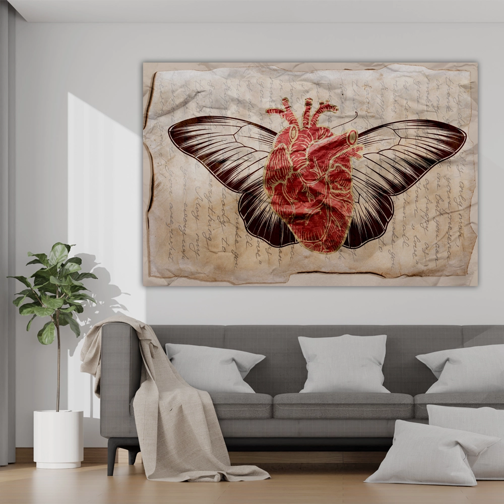 Il Quadro su Tela Heart Letter mostra un cuore dettagliato, colori vividi e con delle ali. A fare da sfondo una lettera scritta con una forma di pergamena quasi a dire ogni cuore ha un manoscritto da leggere.