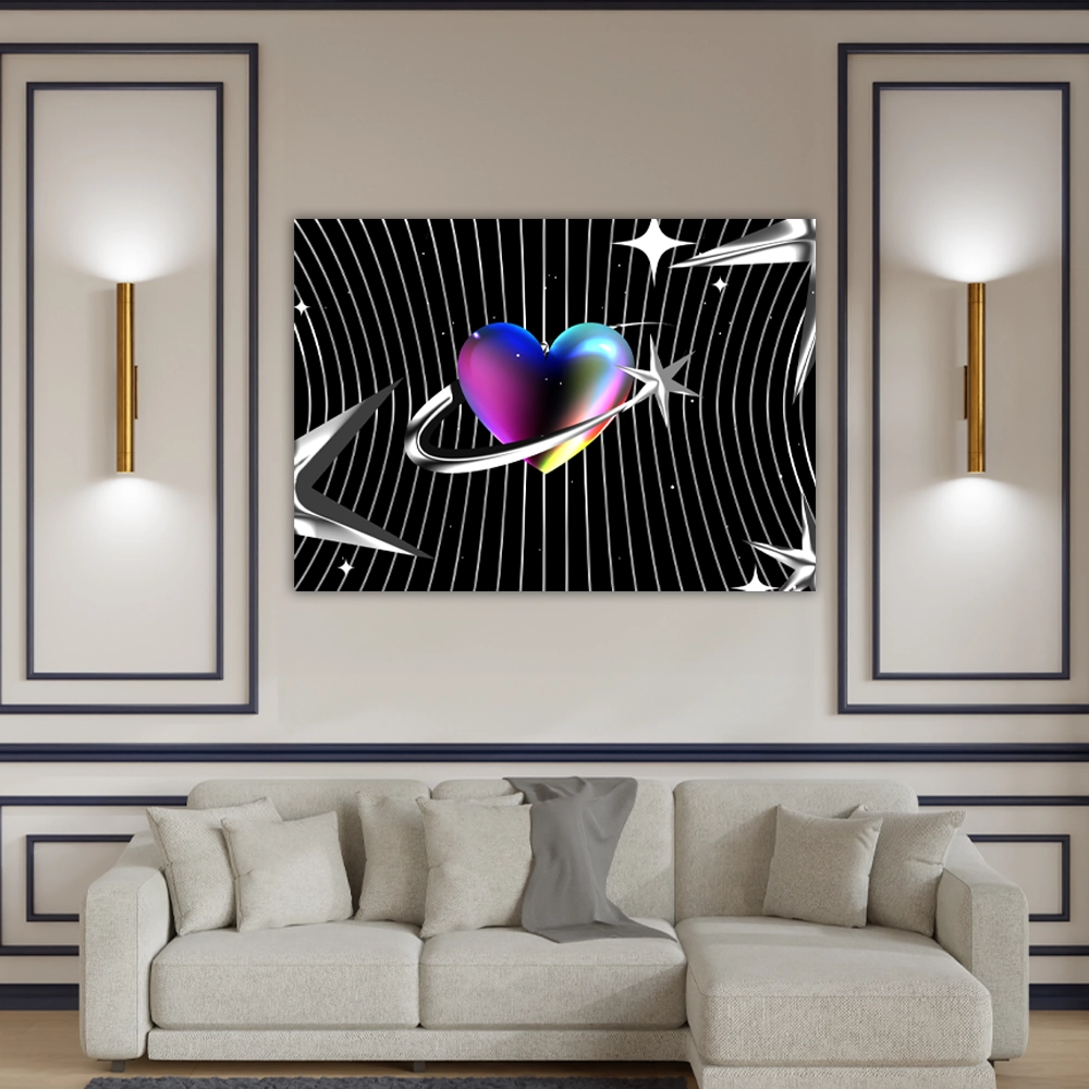 Quadro su tela di un bellissimo cuore multicolor, fondo a strisce nere e bianche, una sorta di spazio. Nel quadro compaiono anche delle stelle per rendere l’idea di un cuore nello spazio.