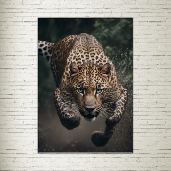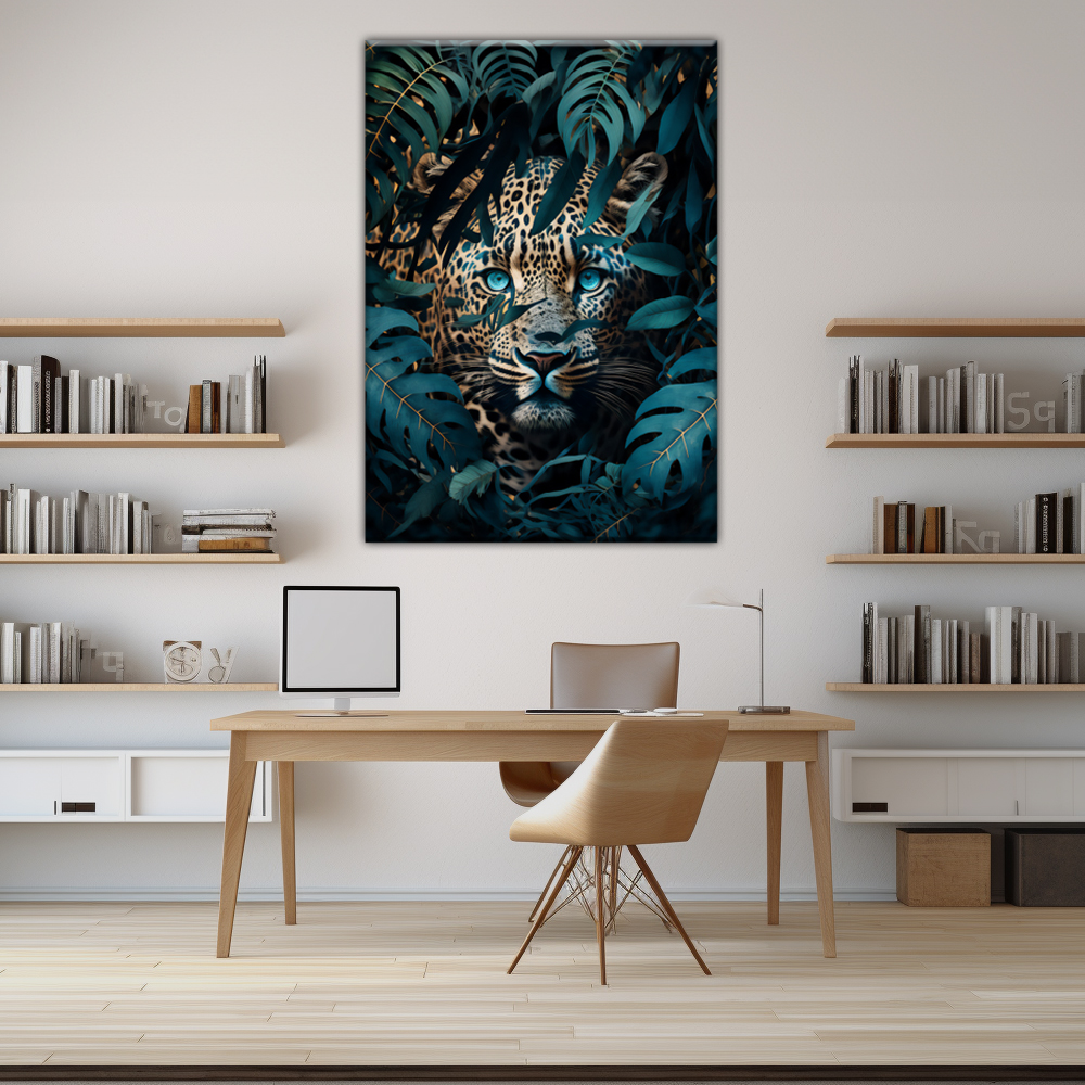 La Bellezza del Leopardo: La tela “Eleganza Selvaggia: Il Leopardo tra le Foglie” ritrae un leopardo, uno degli animali più affascinanti e belli del regno animale. La sua pelliccia maculata si mimetizza perfettamente con l’ambiente circostante.