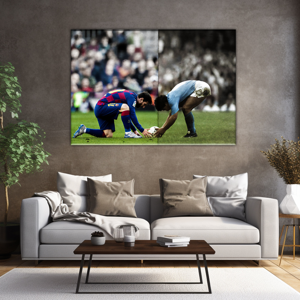 Questo quadro su tela simboleggia il rispetto e l’ammirazione tra le generazioni di calciatori, con Maradona che rappresenta la grandezza passata e l’altro giocatore che incarna le promesse del futuro. La scena è un omaggio alla continuità e all’evoluzione dello spirito sportivo attraverso i tempi.
