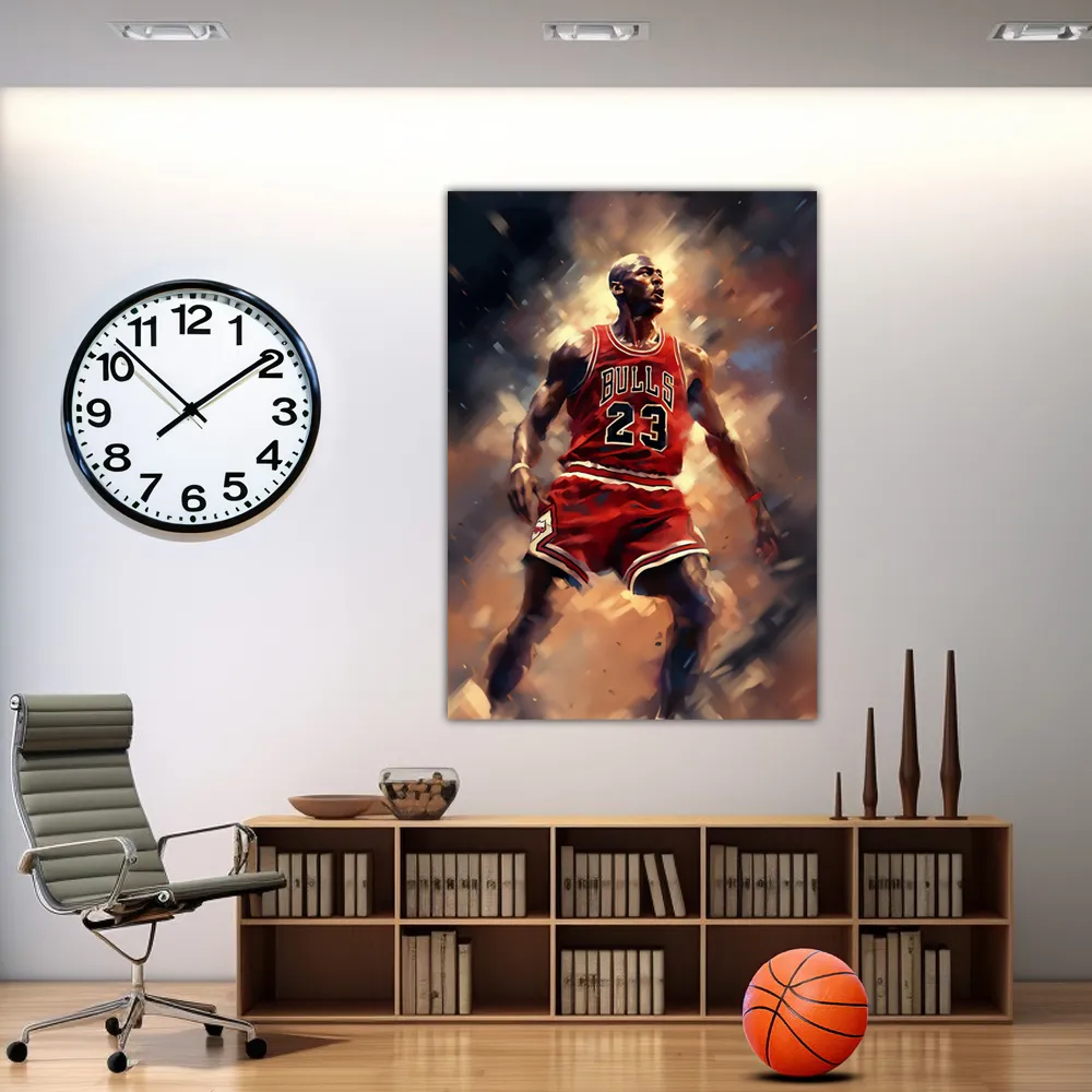 La Leggenda del Basket: La tela “L’Eccellenza del Basket: Michael Jordan in Azione” ti trasporta direttamente in una partita di basket epica, dove Michael Jordan sfodera il suo talento straordinario. Con il suo salto spettacolare e lo sguardo determinato, incarna l’essenza stessa del basket di alto livello.