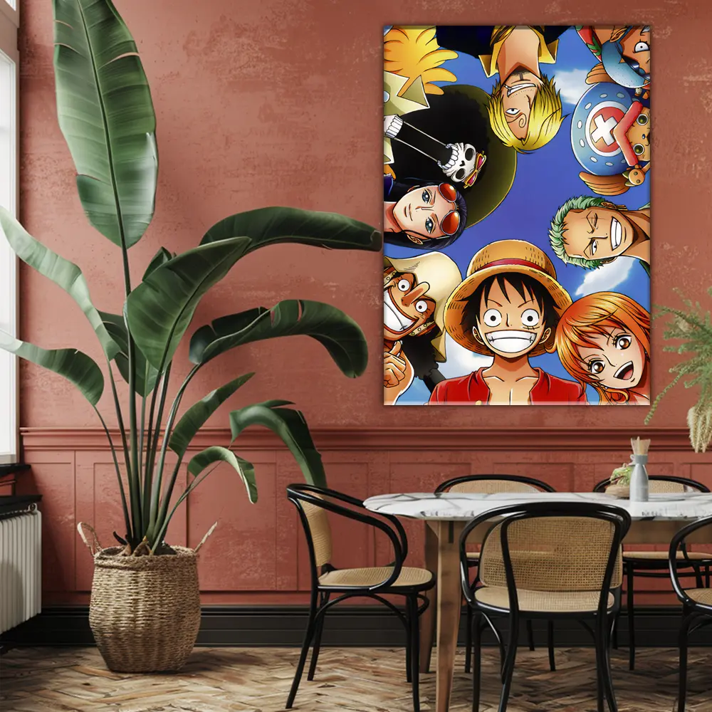Questo quadro vivace su tela presenta l’allegra ciurma di “One Piece”. In posa eroica e giocosa, vediamo il protagonista Monkey D. Luffy in primo piano con il suo caratteristico cappello di paglia, circondato dai suoi fedeli compagni.