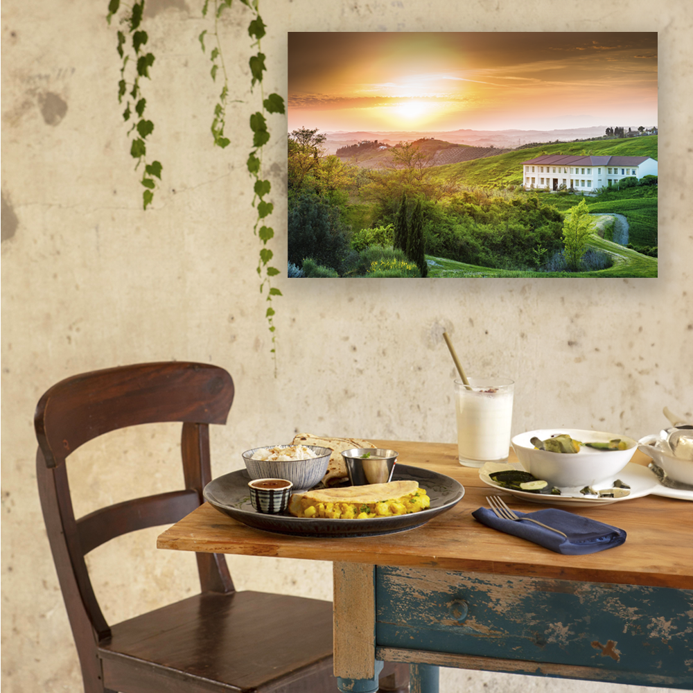 Un’Immersione nella Toscana: La tela “L’Incanto Estivo della Toscana” trasporta chiunque la contempli direttamente nella campagna toscana. I campi dorati ondeggiano sotto il sole estivo, i cipressi si ergono maestosi e il cielo azzurro offre un’incredibile sensazione di spazio e libertà.