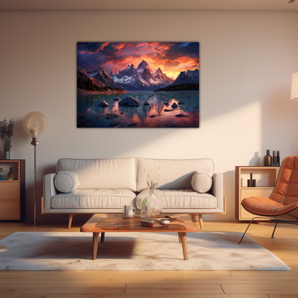 Un’Esplosione di Colori e Serenità: La tela “Tramonto Sulle Montagne” trasporta chiunque la contempli in un mondo di meraviglia naturale. I colori caldi del tramonto si riflettono delicatamente sul lago tranquillo, creando una scenografia incantevole che infonde calma e serenità in qualsiasi spazio
