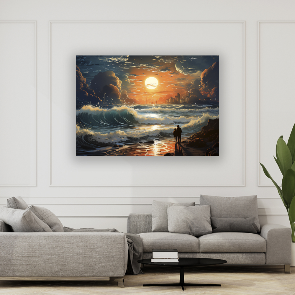 Scopri il romanticismo incantato del quadro “Innamorati al Tramonto: Onde d’Amore”! Questo capolavoro artistico, cattura l’essenza del romanticismo mentre il sole si tuffa nell’orizzonte, creando un cielo sfumato tra nuvole dorate. Con le onde che accarezzano la spiaggia, questo quadro è un inno all’amore e alla bellezza della natura