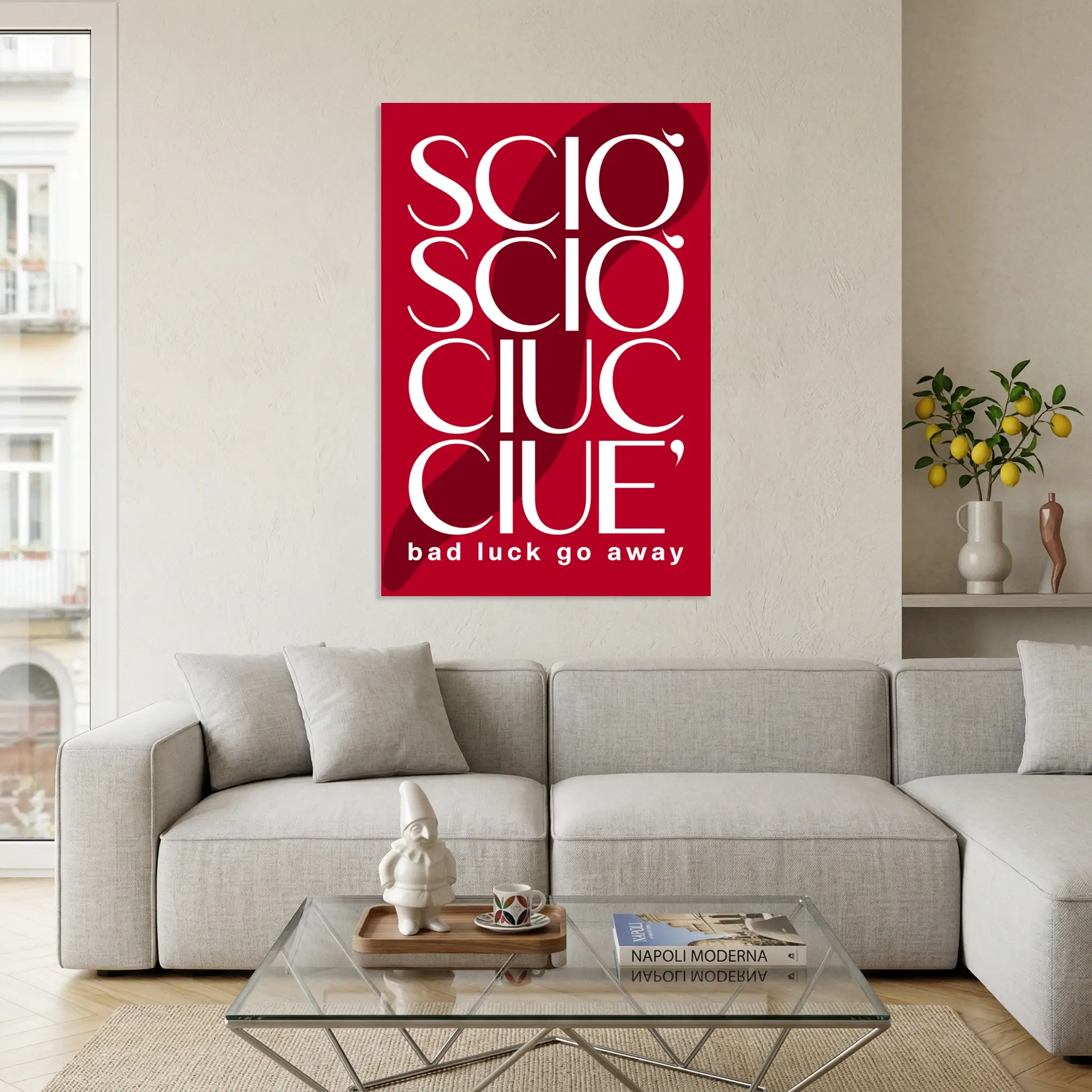Porta fortuna nella tua vita con questo straordinario poster tipografico, un autentico talismano di design contemporaneo. La famosa e antica formula popolare napoletana per allontanare la sfortuna e il malocchio, “Sciò Sciò Ciucciuè”, è qui resa con una tipografia audace e moderna in un rosso vibrante e intenso.