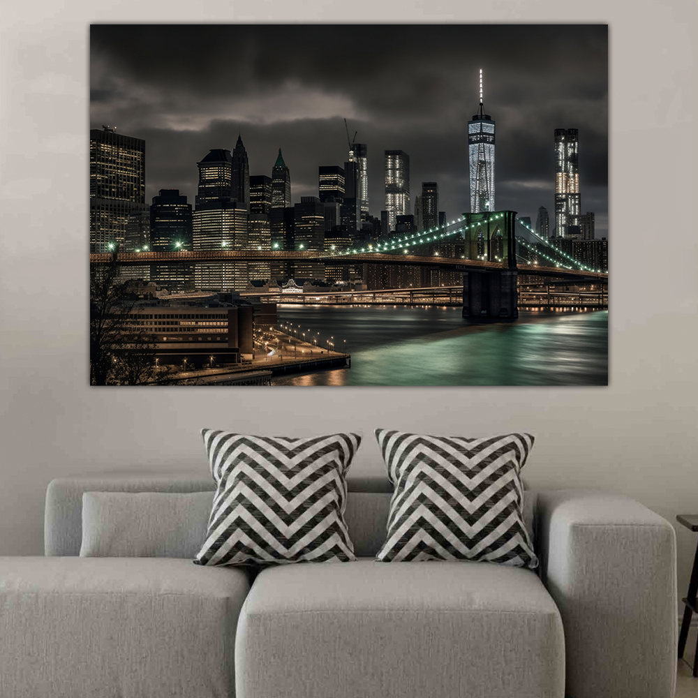 L’Iconica Skyline: La tela “New York di Notte: Luci Scintillanti” presenta la skyline di New York con i suoi grattacieli illuminati. Le luci che si riflettono sull’acqua creano un’atmosfera magica e un senso di vitalitร .