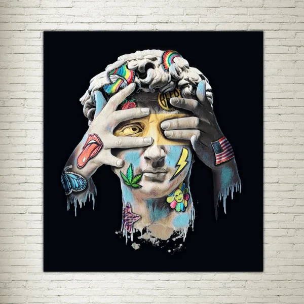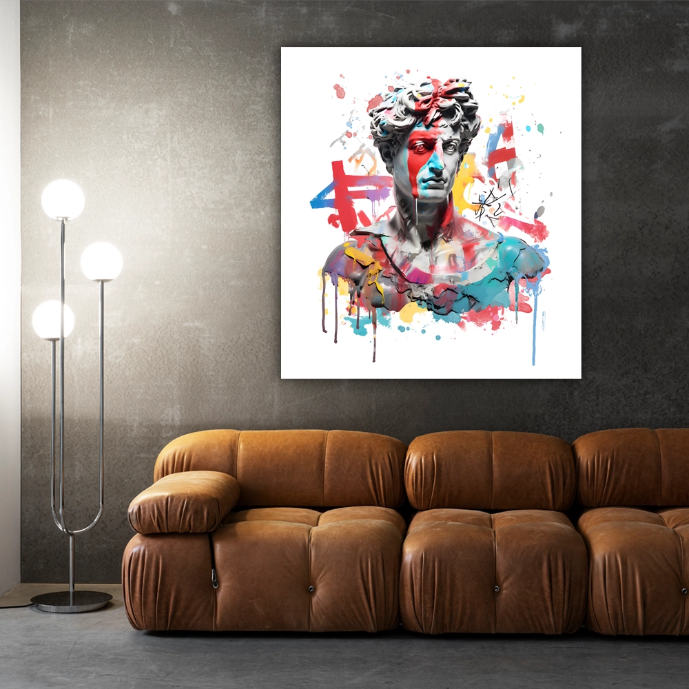 Quadro su Tela Statue Pop Colour, scultura classica rielaborata con elementi contemporanei e colori vivaci che creano un contrasto intrigante tra antico e moderno, evidenziando la dinamica tra forma e colore.
