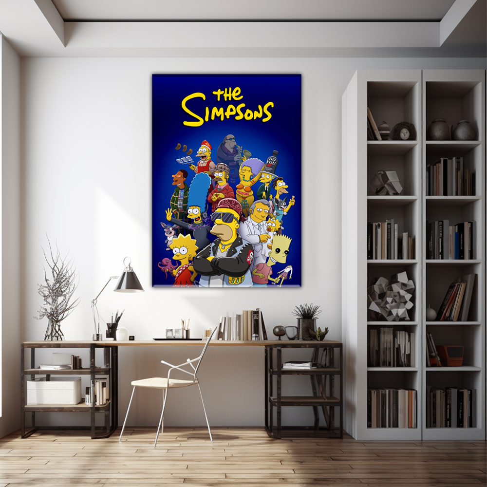 Il quadro su tela presenta una vivace raccolta di personaggi dalla serie animata “The Simpsons”. Al centro spicca Homer Simpson, con la sua espressione tipica e la parola “D’oh!” visibile, circondato da altri membri della famiglia Simpson.