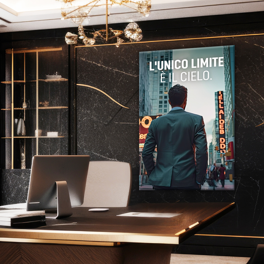 Il Mondo di Wall Street: La tela “Dominare Wall Street: La Motivazione del Successo Finanziario” ti trasporta direttamente nell’universo dinamico di Wall Street, dove l’ingegno e la perseveranza portano al successo finanziario. Con l’immagine di un imprenditore affacciato sui grattacieli di New York e la citazione motivazionale, incarna l’essenza stessa dell’ambizione finanziaria.