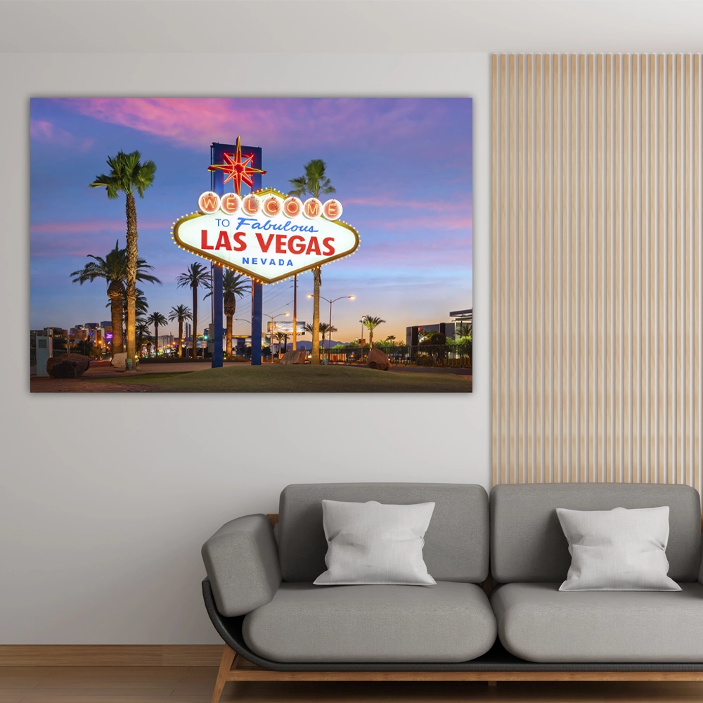 Il Fascino di Las Vegas: La tela “Welcome to Fabulous Las Vegas” presenta il celebre Strip di Las Vegas con il suo grande cartellone come benvenuto nella città. Edifici sfavillanti e i colori sgargianti delle insegne al neon.